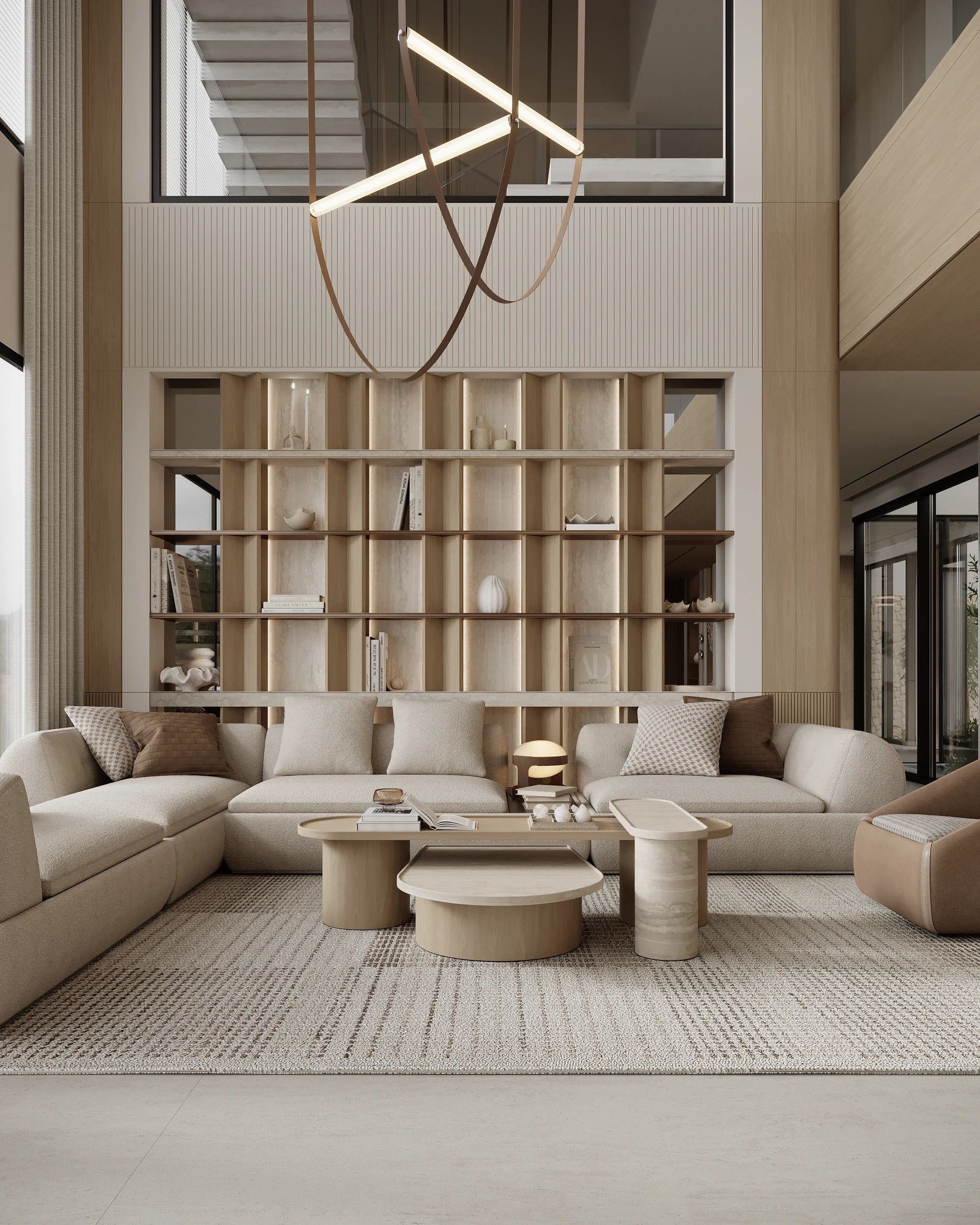 Bu iç mekan konsepti, doğal malzemeler ve mimari denge ile sakin ve lüks bir atmosfer yaratan, biyofilik tasarımla zenginleştirilmiş sıcak minimalizmi somutlaştırıyor. Çift yükseklikteki alan, açıklığı ve ışık akışını artırırken, dikey ahşap unsurlar ve özel raflar yüksekliği ve yapıyı vurguluyor. Açık meşe, traverten, yumuşak bej tekstiller ve sıcak bronz vurgular, heykelsi doğrusal armatürler, gizli tavan aydınlatmaları ve arkadan aydınlatmalı nişleri birleştiren katmanlı aydınlatma ile tamamlanan uyumlu bir toprak tonu oluşturuyor ve derinlik ve sıcaklık katıyor. İç mekan saksıları ve geniş yerden tavana cam cepheler aracılığıyla entegre edilen yeşillik, doğayla bağlantıyı güçlendirirken, yuvarlak, alçak profilli mobilyalar temiz mimari çizgileri yumuşatarak sakin, rafine ve zamansız hissettiren uyumlu bir alan yaratıyor.